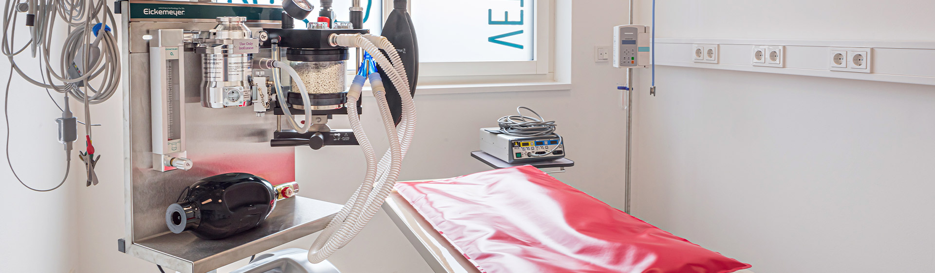 Als Narkoseform wird üblicherweise eine sog. Inhalationsnarkose wie in der Humanmedizin gewählt. Diese Form der Narkose ist eine der schonendsten Narkoseformen, da das Tier einen Tubus erhält und zur Narkose ein Isofluran-Sauerstoffgemisch, was permanent abgeatmet werden kann. Damit ist die Narkosetiefe gut steuerbar und für den Organismus sehr schonend. Zusätzlich erhalten die Tiere im Regelfall einen venösen Zugang für die Gabe von Medikamenten und Infusion während und nach der Narkose. Selbstverständlich wird während jeder Narkose der Kreislauf und die Narkosetiefe von einer geschulten Tierarzthelferin kontrolliert.